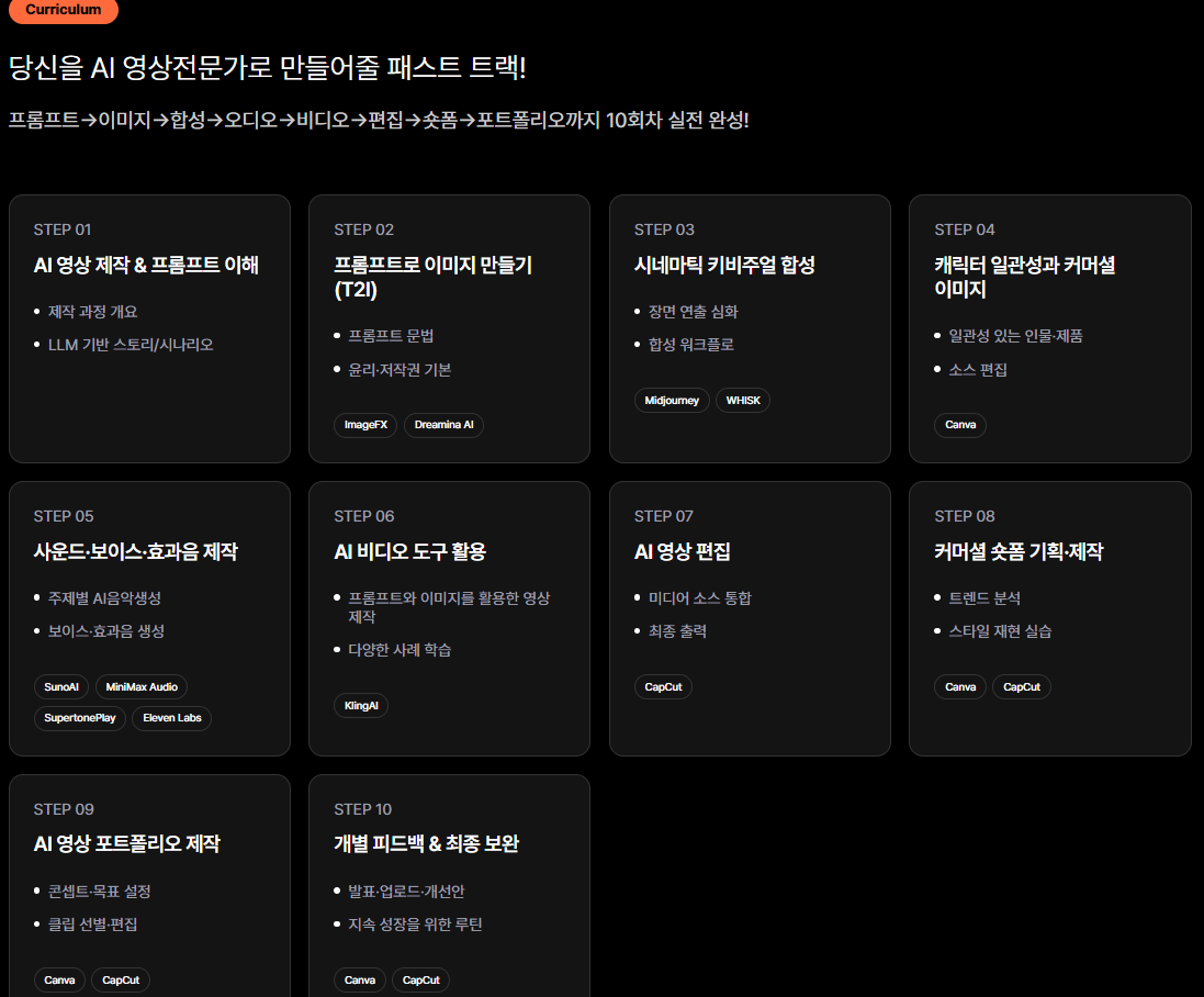 10회차 실전 과정을 통해 AI 영상 전문가로 거듭나게 합니다.
